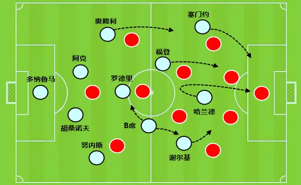 曼城在防守端需要注意曼联球员在强侧持球的同时,弱侧突然无球人高速套上外线(比如图上的达洛特)。