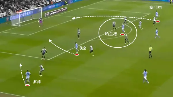 曼城在防守端需要注意曼联球员在强侧持球的同时,弱侧突然无球人高速套上外线(比如图上的达洛特)。
